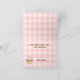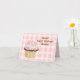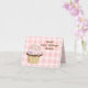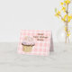 Um cartão de aniversário branco, com um cupcake de chocolate bonito decorado, com glacé cor-de-rosa e corações coloridos, colocado sobre fundo de gingham branco e rosa. Texto marrom divertido, no topo lê-se, doce Feliz Aniversário Deseja. Personalize o dentro de texto e saia com sua própria saudação e nome.