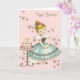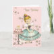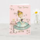 Cartão de saudação de aniversário retrô/vintage. Linda garota com um belo bolo de aniversário! Feliz aniversário!