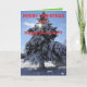 Uma fotografia de uma Árvore de Natal Snowy durante a época de Natal. Isso é brilhante e colorido. Num Cartão Saudável. Com o Sol brilhando jogou a Árvore em forma de estrela. Num dia frio de inverno.