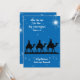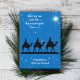 Cartão de Natal cristão com sábios e escritura sobre a estrela. Céu azul noturno com estrelas cintilantes e uma estrela grande. Os três sábios em camelos estão na silhueta negra. O texto branco no topo é, "Quando eles viram a estrela, eles ficaram muito felizes" do livro de Matthew 2:10 NIV versão. Adicione uma assinatura na parte inferior do cartão.