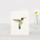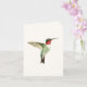 Cartão de saudação de vazio com um Hummingbird com garganta de borracha. O beija-flor arruinado (Archilochus colubris) é um pássaro minúsculo com máscara preta, coroa verde e garganta vermelha brilhante. Estas aves bonito encontram-se em matas abertas, bordas florestais, prados, prados, prados, e em parques, jardins e quintais, onde visitam frequentemente alimentadores de beija-flores e flores em forma de tubo.