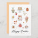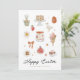 Comemore a alegria da Páscoa com este charmoso cartão de saudação com uma coleção de ilustrações de cores d'água com temas de Páscoa. De um coelho em um pote de flor e um bolo de cenoura a tulipas, doces de Páscoa e candelabras ouros, este design capta o espírito festivo e aconchegante do feriado. Perfeito por enviar desejos calorosos à família e aos amigos.