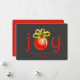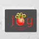 Cartão de saudação de Natal de estilo na moda, feito em fundo de cinza escuro, com texto gráfico vermelho lendo alegria, com o o sendo um ornamento decorado vermelho de bola de Natal. Personalize o texto vermelho, na parte inferior do cartão, para atender às necessidades de sua empresa.