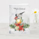 Este cartão de boas-vindas de Natal apresenta uma ilustração aquática digital de um doce adorável, sentado numa lanterna festiva enfeitiçada com poinsetos e verde de inverno, comendo algumas frutas vermelhas. O texto "Feliz Natal" na frente do cartão tem uma textura aquosa adicionada. O dentro de saudação é completamente personalizável ou pode ser deixado como se quiser.