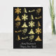 Cartão de saudação de Natal com um olhar de luxo com fundo preto e em ícones de ouro falsos, como sinos, velas, árvores, flocos de neve e renas e o texto: "Feliz Natal e Feliz ano novo!"