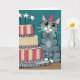 Um cartão de boas-vindas de gato com um tema de aniversário com uma pintura de Lisa Marie Robinson. Uma tábua de cinza por gato senta-se ao lado de um bolo gigante de aniversário de 3 camadas. Copyright © Lisa Marie Robinson Todos os direitos reservados. É ilegal usar ou duplicar isso, ou qualquer uma de nossas imagens, sem permissão por escrito.