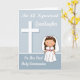Parabéns a sua neta especial pela sua Primeira Comunhão com uma menina adorável vestida de vestido branco com um véu de flor, botões rosa e cinto rosa. O fundo é azul com uma cruz branca com sombreado azul claro e texto branco.