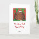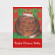 Um gato feliz de tortoisinferno (parecido com um pudim de natal!) senta-se em uma almofada verde contra um fundo vermelho e verde com padrão de folha oca. A mensagem que aparece na frente diz "Desejos Puros do Natal" em branco. O design é personalizável para você adicionar seu próprio nome, mensagem ou ideias. Um desenho colorido original de lápis por Jess Perry.
