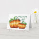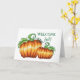 Cartão colorido perfeito para enviar saudações de outono! O cartão apresenta uma ilustração clássica de duas abóboras de esquadrão, ambas uma laranja brilhante alegre e pitoresca. "Bem-vindo ao outono" está escrito acima. Vazio no dentro.