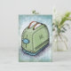 Torradeira em verde e azul com duas fatias de pão branco espiando pelos buracos. Este pequeno aparelho de cozinha fica em um fundo listrado azul e verde.