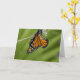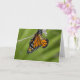 Nova borboleta Monarca Nascer secando suas asas no cartão de saudação do Vazio de vento. A borboleta ainda está segurando seu pupa de casulo. Cartão de saudação da natureza da borboleta.
