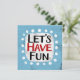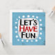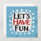"Vamos Tem Divertimento" é um design de texto bonito, em azul claro, com texto preto e vermelho, junto com um sotaque branco e pontos brancos texturizados ao seu redor.