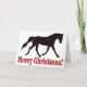 Bonito cartão de Natal de cavalo com um cavalo preto cheio de corações e saudação "Feliz Natal" no fundo. Perfeito para o equestre na sua vida.