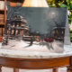 Esta imagem da natal vintage mostra a cena da lua de neve enquanto os convidados chegam de cavalo e trenó para uma festa de Natal na brilhante Mansão Vitoriana. Perfeito nesta placa de cartões de natal.