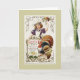 Uma Vintage Girl, vestida de avental e boné brancos, está parada ao lado de um Conselho do Menu de Ação de Graças e de um Tom Turquia. Saudação: Menu de Ação de Graças com Verse! Imagem de um Cartão-postal Vintage de 1917 em um fundo personalizado esverdeado-amarelo.