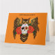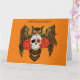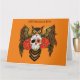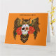 Coruja excelente-marrom com um dia de crânio de açúcar morto e rosa vermelha sol um pano de fundo de laranja