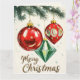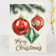 Este cartão de Natal apresenta três ornamentos vibrantes pendurados em galhos de sempre-verde cobertos de neve. Dois ornamentos são clássicos vermelhos com acabamentos brilhantes, enquanto o terceiro é uma decoração verde em forma de diamante. Os ornamentos vermelhos incluem uma bola redonda com pequenas faíscas em forma de estrela e outro com forma de lágrima, decorado com padrões circulares. Abaixo dos ornamentos, as palavras "Feliz Natal" estão escritas em uma fonte dourada brilhante e elegante. O fundo é levemente polvilhado com pequenas estrelas e flocos de neve, dando ao cartão postal um clima festivo e alegre de feriado.
