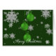 Espalhe a alegria de Natal nesta temporada de festas com um Cartão de Cartões de natal Verde para Enfeites de natal. O design da carta de saudação apresenta um trio de Enfeites de natal suspensos com flocos de neve em queda e um fundo verde escuro. Itens adicionais de presentes e feriados disponíveis com este design também.
