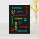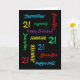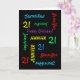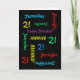 Que cartão de saudação maravilhoso e personalizado para um aniversário de 21 anos ou qualquer outra ocasião. No cobrir, Nome e Idade se repete em diferentes fontes e cores em um plano de fundo preto. Fácil de personalizar - apenas MUDE NOME, IDADE e OCASIÃO EM UM LUGAR. Suporta até 9 caracteres. Um cartão de aniversário colorido e divertido. Crianças, adolescentes e adultos vão adorar! Também é fácil modificar o texto dentro, se desejado. Todos os Direitos Reservados © 2014 Marcia Socolik.