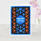 Um cartão de saudação Ramadhan com um padrão tradicional de letícia islâmica em preto sobre fundo azul e laranja. O texto no painel central é branco e diz "Ramadhan Kareem". Design pintado em aquarelas por Judy Adamson. O dentro é o vazio deixado para a sua própria mensagem.