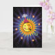 Um sol amarelo e vermelho sorridente com um chapéu de festa e soprador irradiam felicidade para todas as estrelas celestiais e atiradoras. Sentimento é: "Hoje é o seu dia para ser o centro do Universo." ©Mindy Pierce