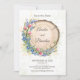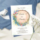 Cartão de save the date de casamento rústico com flores silvestres, lavanda e mirtilos dispostos em torno de uma fatia de madeira natural. Ideal para casamentos florestais, boho ou rústicos. Personalize com os detalhes do seu casamento para um visual quente e natural.