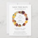 Este cartão de save the date de casamento elegante apresenta uma linda grinalda floral em aquarela amarela, laranja queimada e borgonha. Projetado para combinar com nossa coleção de casamento Autumn Romance. Personalize-o com seus detalhes de forma fácil e rápida, basta pressionar o botão personalizar para reorganizar e formatar o estilo e a colocação do texto. (c) The Happy Cat Studio