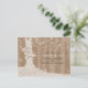 Um cartão postal de save the date de casamento com uma ilustração de uma árvore na floresta. A árvore tem folhas, raízes expostas e um tronco envolto em uma faixa que pode ser personalizada com os nomes da noiva e do noivo. O fundo é inspirado em papelão.