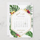 Cartão Save the Date com design tropical, folhas tropicais, floral amarelo e vermelho, geométricos dourados e caligrafia. Fácil de personalizar calendário no verso onde você também pode destacar a data com uma pequena folha tropical.
