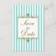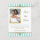 Este elegante e sofisticado cartão de save the date com foto em azul aqua e listras brancas com detalhes em dourado é feito em papel branco básico e tem um espaço para você adicionar sua própria foto digital. O texto e a escolha do papel são personalizáveis. Se você precisar de itens adicionais que combinem, envie um e-mail para niteowlstudio@gmail.com com sua solicitação.