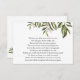 Um cartão de inserção de solicitação de dinheiro para chá de noiva. Com clementina em aquarela e verde com poema: temos nossos pratos e toalhas para dois, panelas e frigideiras e uma torradeira também. facas e garfos e colheres de sobra, Não há muito espaço para mais nada! então, se para o chá você gostaria de trazer um presente, um cheque ou dinheiro nos daria um ânimo. talvez você possa ajudar com as despesas da nossa lua de mel ou onde fica nossa casa é