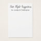 Aqui está um acessório divertido para pegar sua festa de noivado ou chá: cartões de sugestão noturnos de data nos quais os convidados podem escrever notas pessoais para a noiva e o noivo. Na frente você lê "Sugestões da Noite de Data" em uma fonte elegante e moderna de script; esta fonte é editável para que você possa escolher outra se preferir... ou até escrever uma mensagem diferente. Abaixo tem um lugar para seus nomes. Todas as palavras são apresentadas em preto sobre um fundo branco editável. Por favor, não hesite em contactar-me se tiver pedidos especiais ou necessitar de outros pontos. Também me apraz ajudar na personalização destes cartões, se for necessário. //