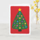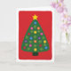 Uma ilustração moderna de uma árvore de Natal com luzes multicolores e uma estrela amarela sobre fundo vermelho. Composição digital de acrílico pintado à mão no papel. As cores da ilustração incluem vermelho, verde, azul, amarelo, roxo e laranja. DENTRO: Vazio