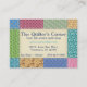 Um design de colcha brilhante agarra as bordas da frente desta cartão de visita criativa. Sombras de azul, rosa, ouro amarelo, verde e aqua criam amostras divertidas de "tecido" na manta de retalhos. O texto é totalmente personalizável usando modelos fáceis e fornecidos. O texto também pode ser adicionado ao verso, que é uma cor neutra de creme. Design mostra aqui no cartão de visita único e memorável estilo chubby.
