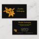 Este cartão de visita anuncia um serviço ajardinando. Caracteriza lírios amarelos dourados em um fundo preto puro. Todo o texto pode ser personalizado para caber suas necessidades do assunto pessoal.