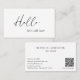 Cartão de visita de tipografia moderna, em preto e branco, apresentando um design simples e mínimo com "olá" em uma tipografia de script elegante junto com sua mensagem personalizada. A parte traseira tem as suas informações de contato e o Código QR opcional. Você pode remover o Código QR e alterar as cores das fontes e do plano de fundo na ferramenta de edição de design.
