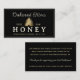 Ouro clássico em cartão de visita de apiário preto com delicada borda de duas linhas. Informações de contato adicionais sobre o texto descritivo anterior e editável sobre seus produtos e localidade. "Obrigado por apoiar seus apicultores locais" está escrito em roteiro.