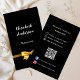 Um clássico fundo negro. Decorado com um arco ouro. Personalize e adicione seu nome, título e informações de contato. Adicione o URL/link do seu site ao código Qr. Com ícones do Facebook e Instagram. Texto branco.