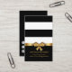 Os cartões de visitas verticais elegantes apresentam um padrão de riscas horizontal em preto-e-branco, uma fita colorida em ouro IMPRESSA com um ARCO OURO e uma parte inferior preta que você pode personalizar com seu nome e seu monograma inicial em lindas fontes de script.