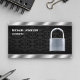 Cartão de visita profissional de serralheiro com cadeado com sotaque metálico sobre fundo negro. Personalize-o com o seu nome e os seus contatos para dar uma primeira impressão duradoura.