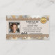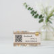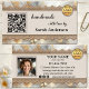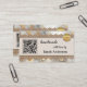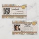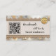 Cartão de visita com um design boho chic com um cadarço de ouro metálico em canvas com fundo de vidro. São adicionados vários modelos: um código QR, logotipo e mídia social. Você pode personalizá-los e substituir os ícones das mídias sociais por seus ícones personalizados. Na parte de trás está também o espaço para sua própria foto. Um cartão de visita profissional moderno para quem cria produtos artesanais ou presentes feitos à mão.