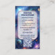 Cartão de visita com ilustração celeste das galáxias com planetas e estrelas. O modelo de código QR pode ser facilmente personalizado ou excluído. Bonita para um astrólogo profissional.