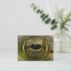 Esta carteira de artista apresenta um olho de sapo verde perto de um olho verde enquanto ela flutua no lago num dia quente de verão. Sua íris é um incrível padrão abstrato de ouro e amarelo. O aluno preto puro e oval no centro reflete árvores a distância.