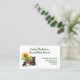 Cartão de visita com design de gatos e hortas. Uso para serviços domésticos, casa, água de plantas, babá e qualquer serviço de assistência. A imagem é de um gato preto e um gatinho próximo a um pote de raízes frescas, junto com um girassol. Mais girassóis estão nas costas. O texto é verde-escuro com script em negrito na parte superior para um nome comercial ou nome pessoal em uma ou duas linhas. Adicione mais texto impresso, que se alinha à direita para informações e contato.