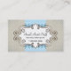 Este cartão de visita azul doce das bolinhas evoca a doçura de seus elementos gráficos à paleta de cores. O fundo é taupe com uma folha de prova do teste padrão de ponto. O nome da empresa, a descrição, e o contato principal estão para fora em um quadro ornamentado com curlicues. O reverso revela o mesmo fundo com o resto da informação do negócio com o elemento scalloped azul que limita na parte superior e na parte inferior. Aproprie para um negócio alinhado ao setor feminino, um estabelecimento da comida que se especialize em deleites doces ou em um boutique. Disponível em cores alternativas com produtos de harmonização.