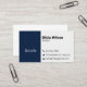 Design de cartão de visita branco e azul, moderno, elegante e profissional com campos modelo para nome, nome da empresa e informações de contato.