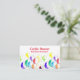 Um cartão de visita com balões coloridos em um arco-íris de cores desenhadas com marcador e aquarela com confete espalhado por todo o lado. Cartão festivo para anunciar o seu negócio.