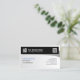 Esta cartão de visita de serviços financeiros de livraria tem um simples design que consiste em uma faixa preta no topo, lançando uma sutil sombra em direção à direita. O logotipo, o nome e o slogan da sua empresa aparecem nesta faixa. Se você tem um código QR, você pode colocá-lo no lado direito da faixa. Seu nome, título e números de contato aparecem abaixo desta faixa à esquerda enquanto seus detalhes de contato comercial aparecem à direita. Perfeito para finanças, investimento, gestão, administração, marketing, profissional, serviços empresariais, temas limpos, simples, mínimos, profissionais, elegantes.
