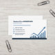 Um cartão de visita em tons azuis com uma ilustração de um gráfico de bares. As informações de contato são decoradas com ícones. Perfeito para atividades como consultor empresarial, contabilista, serviços fiscais, gestor de investimentos, analista, etc.