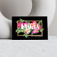 Um lindo e chic design motif com um buquê colorido de flores pica atrás da palavra "Lashes". Enquadrada em uma caixa de folhas metálicas falsa de ouro e personalizada com seu nome embaixo, esta é a cartão de visita de extensão perfeita do salão de cinzas. O design de dois lados permite uma ampla margem para as suas informações de contato no verso. Arte e design © 1201AM CREATIVE